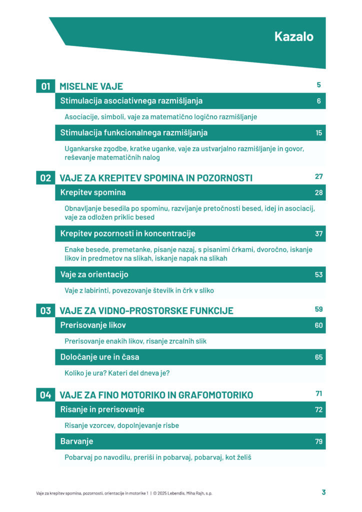 Miselne vaje z ugankami in nalogami, vaje za krepitev spomina, pozornosti in orientacije, vidno-prostorske naloge ter vaje za fino motoriko in grafomotoriko.